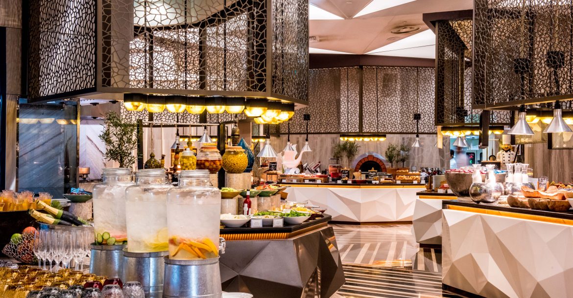 The epicurean dining expedition starts with a selection of fresh oyster, poached prawns, , seabass ceviche, sushi corner, followed by signature mains such as Seafood Paella, smoked king fish, Black tea salmon gravlax, French mussels, Moroccan seafood tagine, Fish Kofte and succulent barbecued cuts.