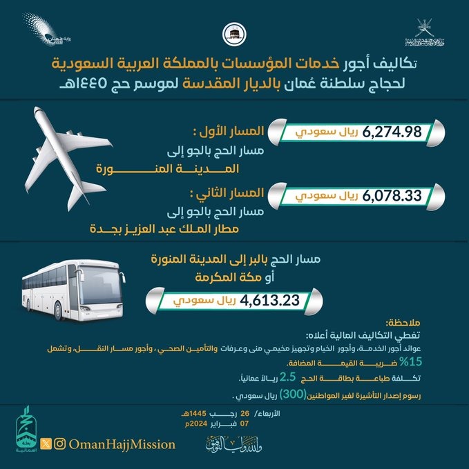 The Ministry also stated that the mentioned costs cover service fees, tent and equipment for camps in Mina and Arafat, health insurance and transportation fees, including 15 percent value-added tax, the cost of printing the Hajj card (RO 2.5) and visa fees (300 Saudi riyals) for non-Omanis.