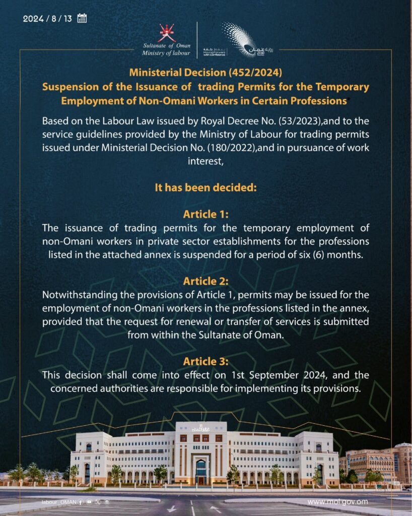 Article 1: The issuance of trading permits for the temporary employment of non-Omani workers in private sector establishments for the professions listed in the attached annex is suspended for a period of six (6) months.