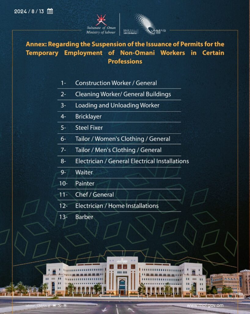 MUSCAT : The decision, effective from September 1, 2024, aims to prioritize Omani nationals for employment in roles such as construction workers, cleaners, loaders, bricklayers, steel fixers, tailors, electricians, waiters, painters, chefs, and barbers.
