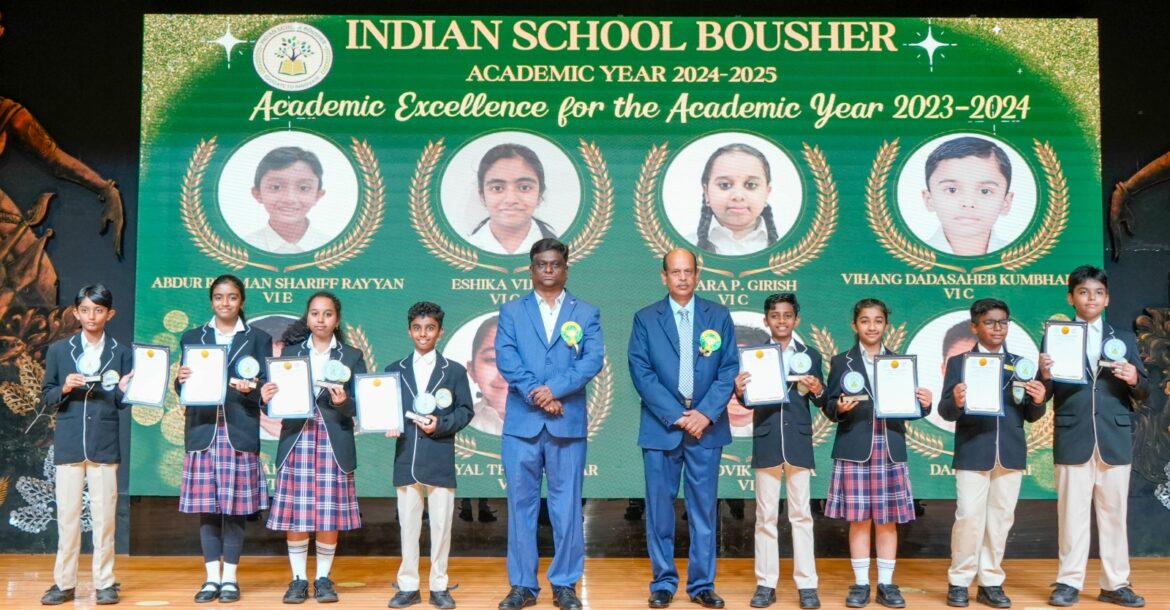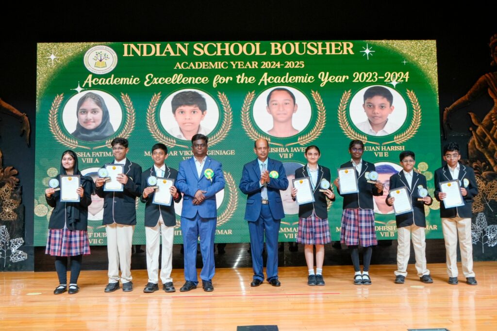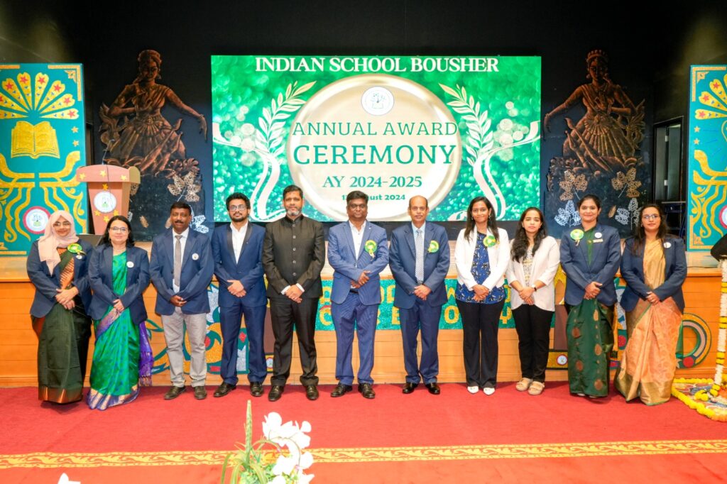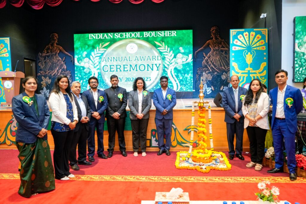 Muscat – Indian School Bousher hosted its Annual Award Ceremony with great enthusiasm, celebrating the outstanding achievements of its students. The event was honoured by the presence of Chief Guest Dr. Sivakumar Manickam, Chairman, Board of Directors for Indian Schools in Oman, and Guest of Honour Ms. Ashwini Sawrikar from the Academic Committee of the Board of Directors for Indian Schools in Oman, along with Dr Sayed Fazlur Rehman, Convenor, Chairperson – Sports and Co-Curricular Sub-Committee, Mr Piyush Agarwal, Treasurer, Chairperson – Finance Sub-committee, Mr Shanmugam Purushottaman, Chairperson –Building and Infrastructure Sub- Committee, Dr Vinod Patchigalla, Chairperson – HR Sub-Committee, Ms Sowmiya Parameswaran, Chairperson – Staff Welfare and Grievance Redressal Sub- Committee and Ms Remya Damodaran – Member, Building and Infrastructure Sub-Committee.