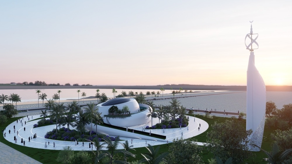 The oval-shaped prayer hall will be illuminated by a central skylight, while the minaret draws inspiration from the Omani sail and traditional incense burner, crowned by the crescent – blending Islamic symbolism with contemporary design.