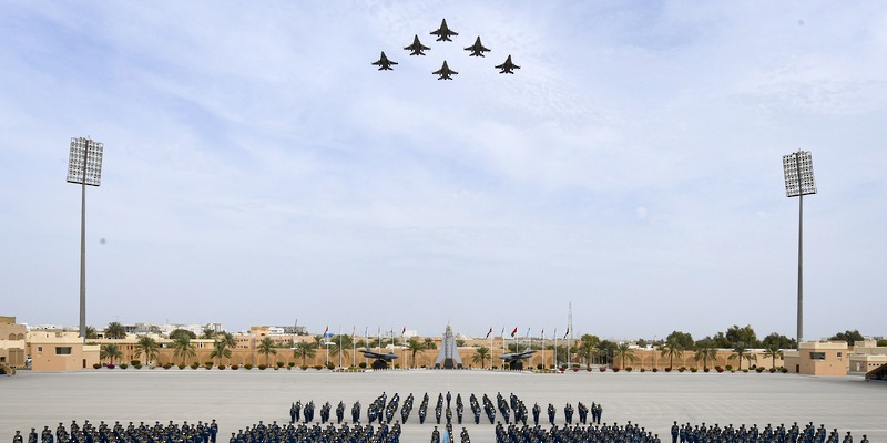 The ceremony began with a military salute upon the arrival of the patron, followed by the playing of the Royal Anthem by the Royal Air Force of Oman Band. His Highness then inspected the front ranks of the graduating officers before the parade commenced, led by the flag of the Sultan Qaboos Air Academy.