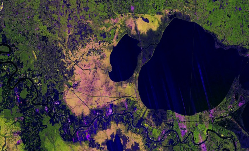 It captures major landmarks including New Orleans and Baton Rouge, the Mississippi River, Lake Pontchartrain, and a diverse patchwork of wetlands, farmland, forests and residential areas.