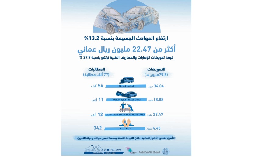 MUSCAT: Preliminary data from the Financial Services Authority (FSA) show that insurance firms recorded around 75,300 traffic accidents in 2025, compared with 75,200 in 2024, a slight rise of 0.1 per cent. Of these, 54,271 were minor accidents, representing about 72.1 per cent of the total, while 20,993 were serious, around 27.9 per cent. Serious accidents saw a notable increase of 13.2 per cent from 2024, reflecting a qualitative shift toward more serious incidents.