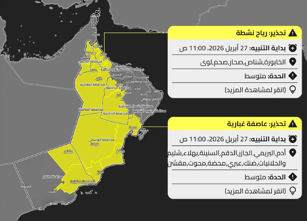 MUSCAT – The Met office said an active wind alert is in effect from 11 am on April 27, 2026, affecting Al Khabourah, Shinas, Saham, and Suwaiq. The warning is classified as moderate in severity.